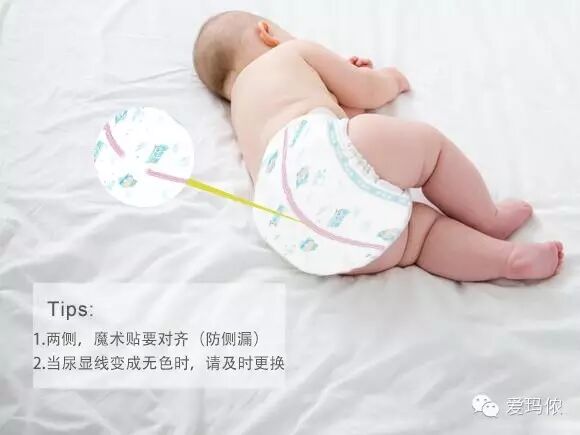 纸尿裤两边各有一个魔术贴,在粘贴魔术贴的时候,妈妈们不仅要根据宝宝的腰围选择合适的粘贴位置,更重要的是确保左右两边的魔术贴都选择同样的位置粘贴,这样才能避免纸尿裤不穿歪,减少侧漏的可能性。