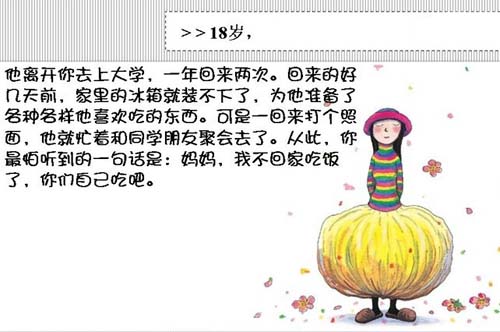 18岁他离开你去上大学,一年回来两次。回来的好几天前,家里的冰箱就装不下了,准备了各种各样他喜欢吃的东西。